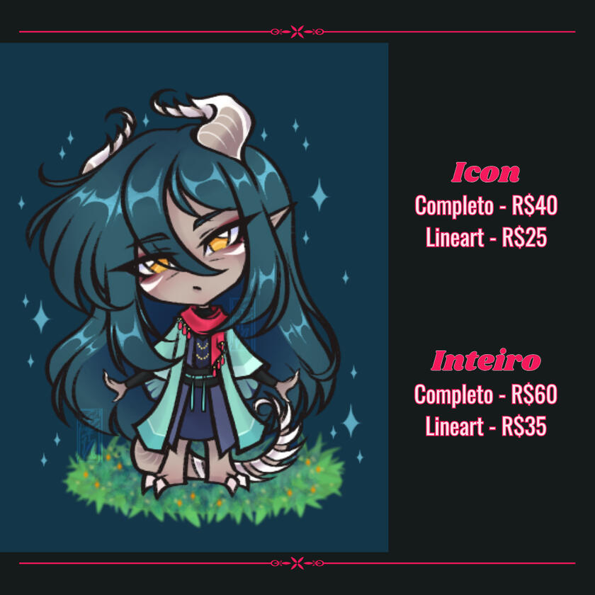 Alterações: serão toleradas até 2 grandes alterações, passado desse limite, o valor padrão das encomendas não cobre mais alterações, eu peço que pague pela alteração pelo menos metade do valor por personagem (ex: Chibi inteiro é 60 reais, metade ficaria 30 por cada nova grande alteração). No caso da alteração ser do cenário, o valor será medido a partir do tamanho do cenário com relação a alteração (ex: cenário grande de praia R$300, alteração seria para mudar o céu inteiro por tanto uma alteração grande já que o céu ocupa metade da ilustração, 50% do valor) ou (ex: mesmo cenário R$300, alteração mudar uma cadeira de posição mais ao fundo, a cadeira ocupa 30% do cenário, por tanto 30% do valor). Alterações pequenas tem uma tolerância maior, dependendo da quantidade de alterações eu peço o valor fixo de 20 reais por alteração.